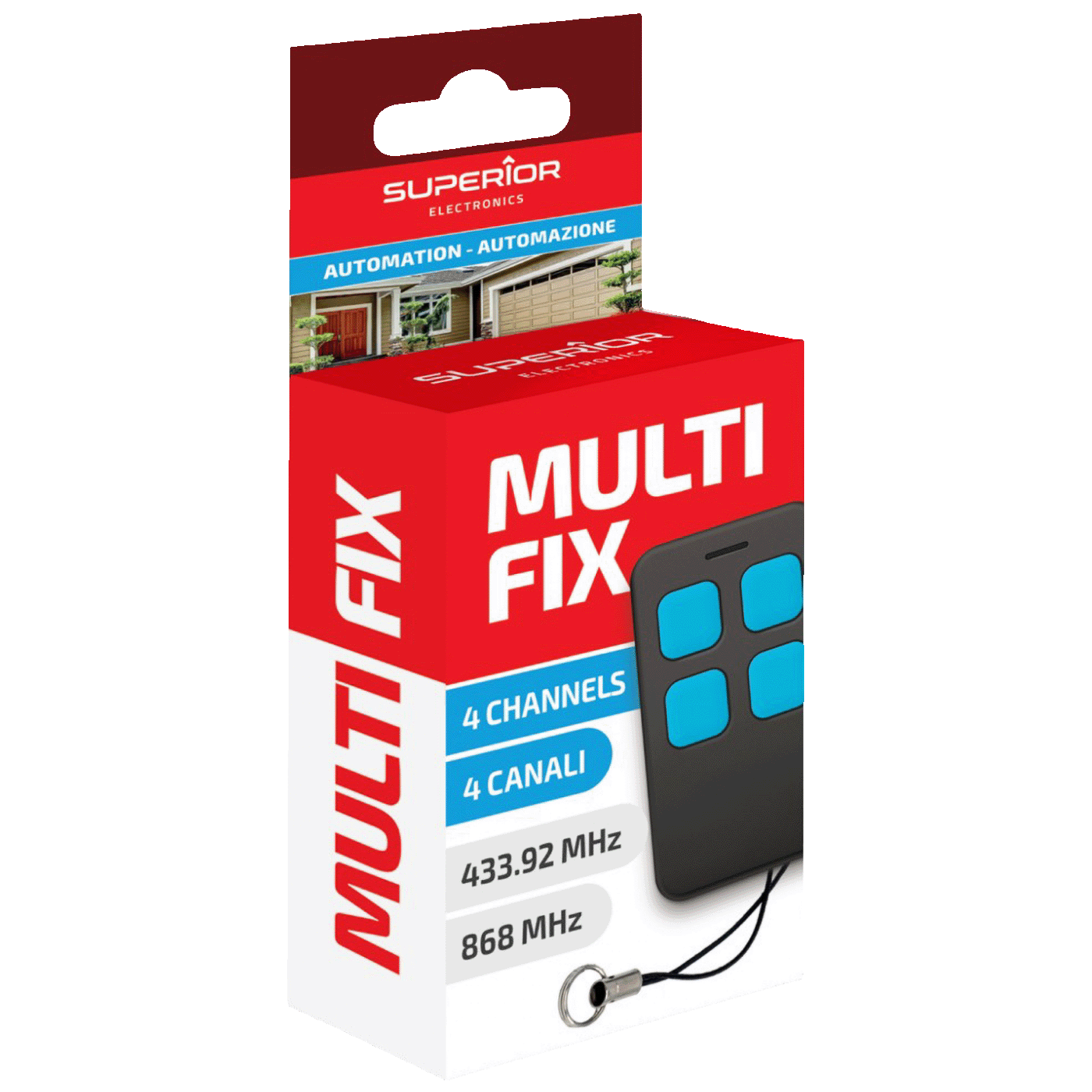 Superior Electronics Multi-Fix je univerzalni RF daljinski upravljač namijenjen za upravljanje garažnim vratima, kapijama i drugim automatiziranim sistemima koji koriste fiksni (fixed code) signal. Ovaj model predstavlja praktično rješenje za zamjenu više originalnih daljinskih upravljača jednim uređajem.