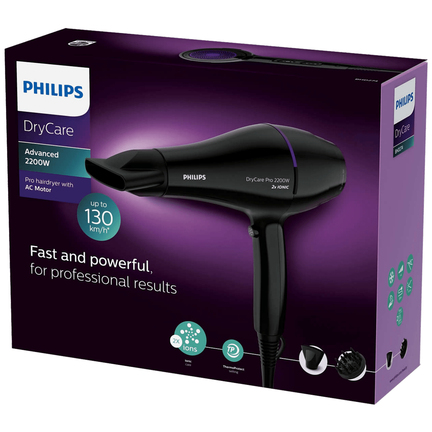 Sušilo za kosu Philips Pro ima profesionalni AC motor koji doseže brzinu protoka zraka do 130 km/h kako bi se postigli brzi i profesionalni rezultati. Ima i postavku ThermoProtect za optimalnu temperaturu koja štiti od pregrijavanja.