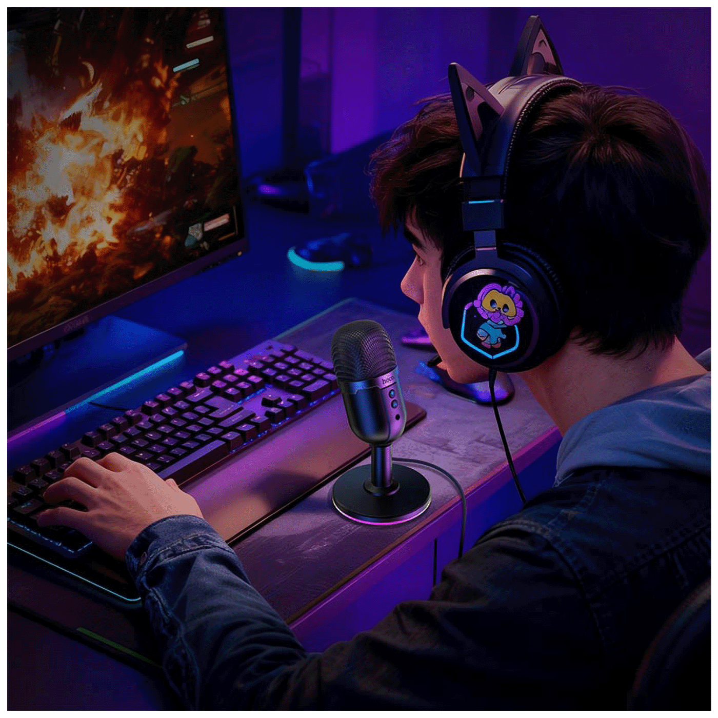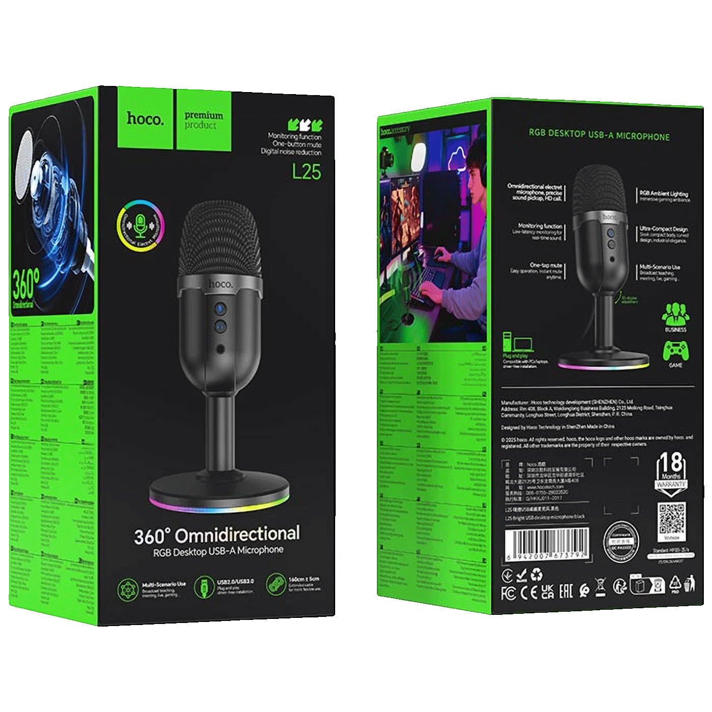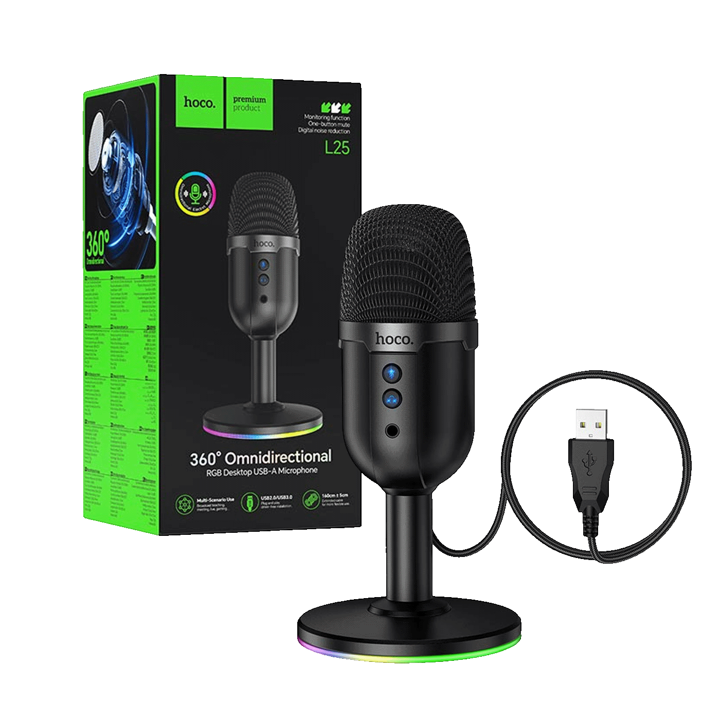 HOCO L25 je desktop USB mikrofon s punim usmjerenjem i RGB osvjetljenjem, idealan za streaming, online konferencije, snimanje glasa i podcasting. Omogućava čist zvu...