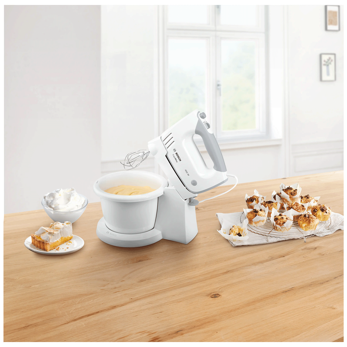 Bosch ErgoMixx MFQ36460 je svestran kuhinjski ručni mikser s misom i rotirajućom bazom koji olakšava pripremu smjesa za pečenje, miješanje, pjenjenje i čak mijesenje lakših tijesta bez potrebe da držiš mikser ...