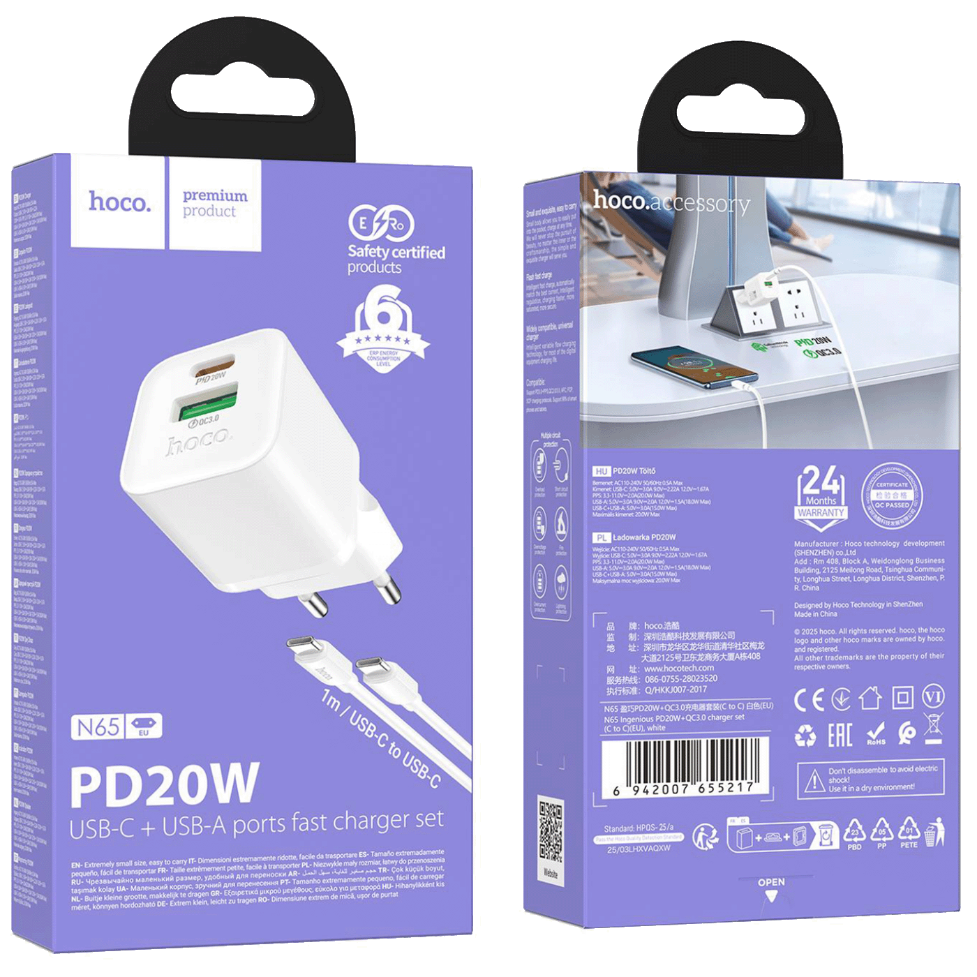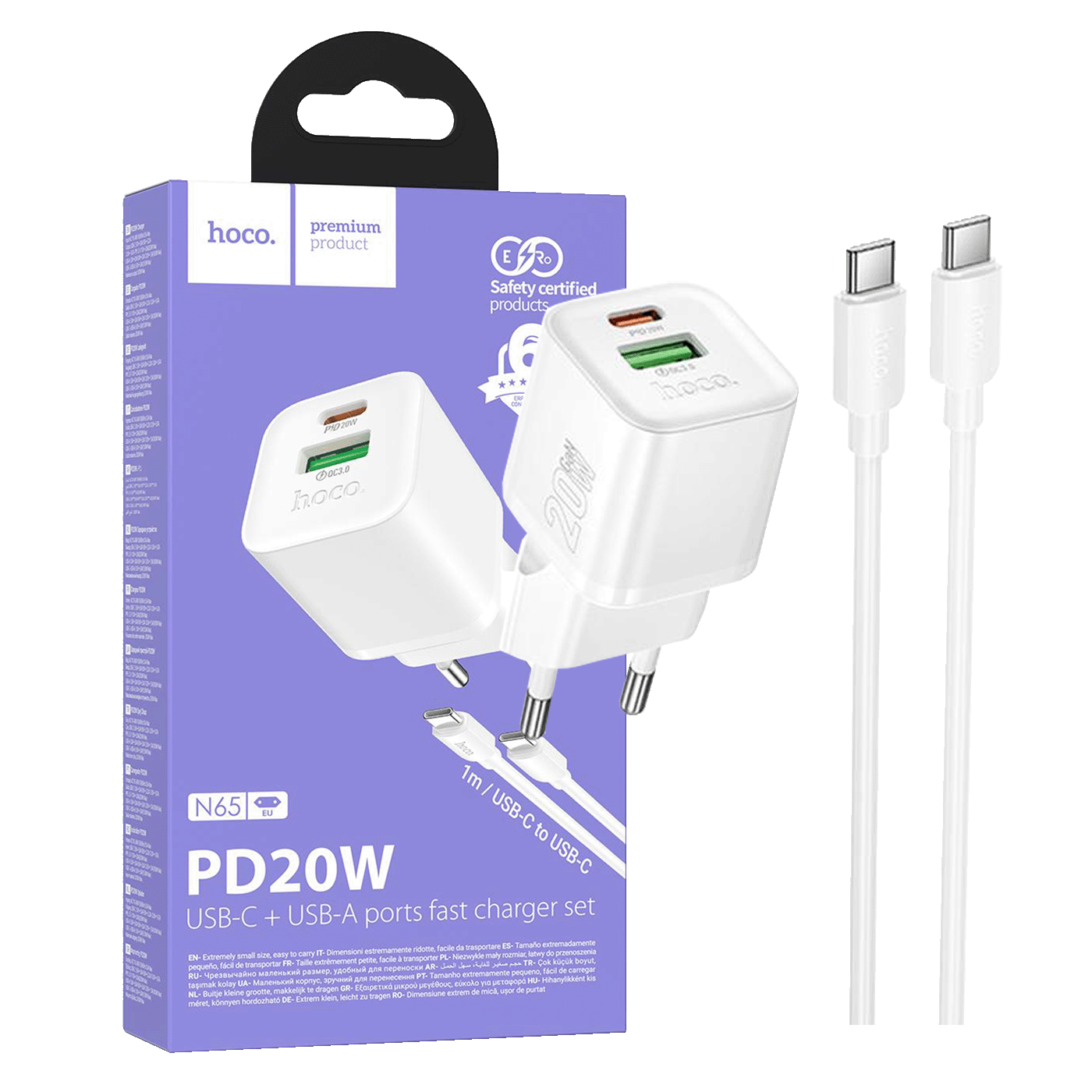 HOCO N65 PD20W QC3.0 – Brzi USB punjač sa USB-C – USB-C kabelom dužine 1 metar