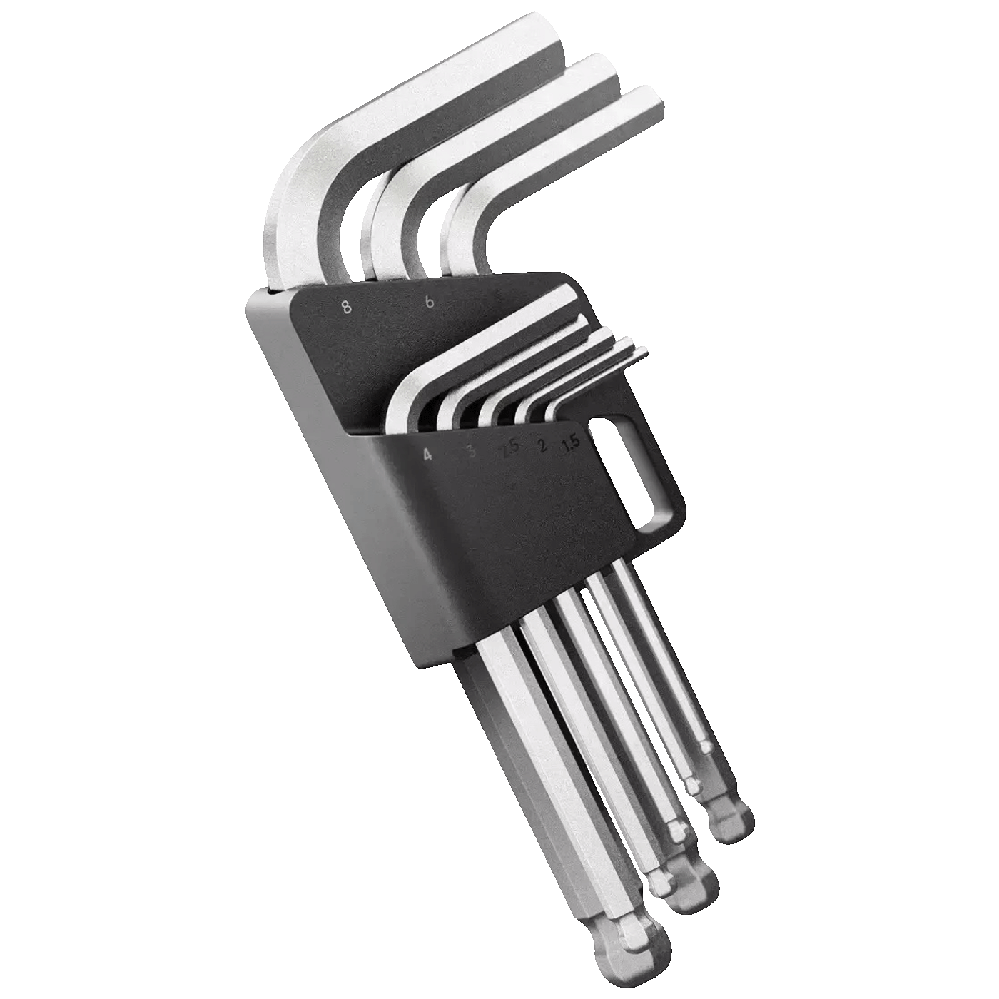 Set imbus ključeva u 8 različitih veličina, izrađen od izdržljivog čelika, s kuglastim krajem od 25° za lakše korištenje pod kutom.